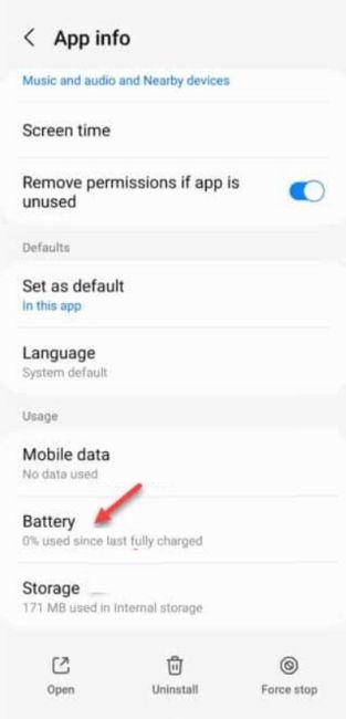 Paso 3:Aparecerá la página de información de la aplicación. Haz clic en la opción Batería de este menú.
